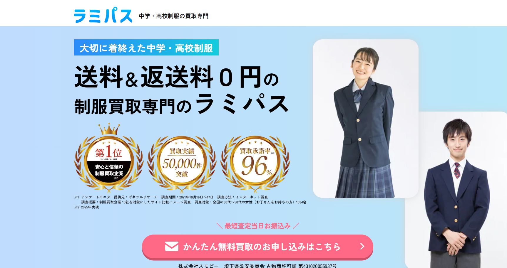 「制服を売ったことがバレないか心配」という方もご安心ください。ラミパスは法令を遵守した運営を行っており、個人情報の管理も徹底。安心して任せられる、クリーンな買取サービスです。