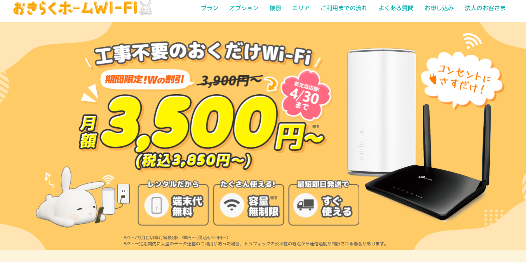 「おきらくホームWi-Fi」は、回線工事を一切行わずに、自宅のコンセントに専用端末を挿すだけでインターネットが利用できるホームルーターのレンタルサービスです。